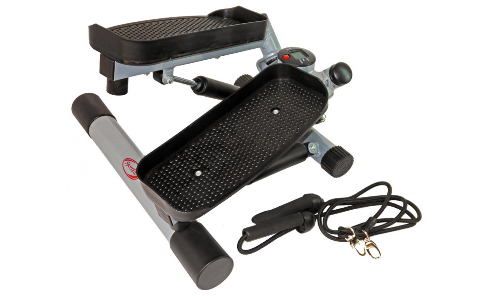 Степпер поворотный с эспандерами Sport Elit SE5112 удобный и функциональный домашний тренажер, который способен поддерживать физическую форму пользователя с любым уровнем подготовки. Эффективность тренажера безусловна, несмотря не свои более, чем компактные размеры, этот тренажер способен отлично «прокачивать» и поддерживать тонус всех самых важных групп мышц. Дополнительные эспандеры позволяют очень эффективно работать с мышцами рук, спины, пресса. Приобретая поворотный степпер с эспандерами Sport Elit SE5112 всего один раз, вы приобретаете компактный спортзал, который всегда будет у вас под рукой. Конструкция тренажера отлично продумана: стальная рама, широкие удобные педали, нескользящая поверхность, надежный механизм, прочные эспандеры делают тренажер более, чем долговечным и надежным. Встроенный компьютер сообщает пользователю все основные параметры тренировки, что позволяет пользователю самостоятельно следить и планировать тренировочный процесс.